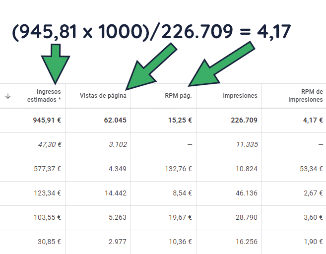 - RPM (Revenue per thousand): lo que tú ganas por cada 1.000 visitas
