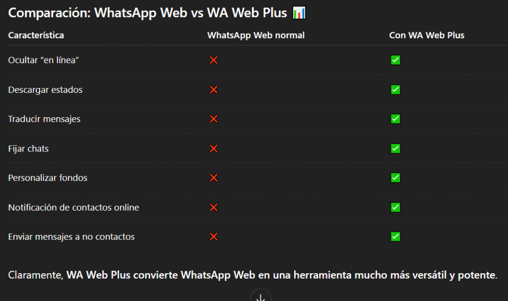 En pocas palabras: lo que WhatsApp Web no te da, WA Web Plus lo añade.