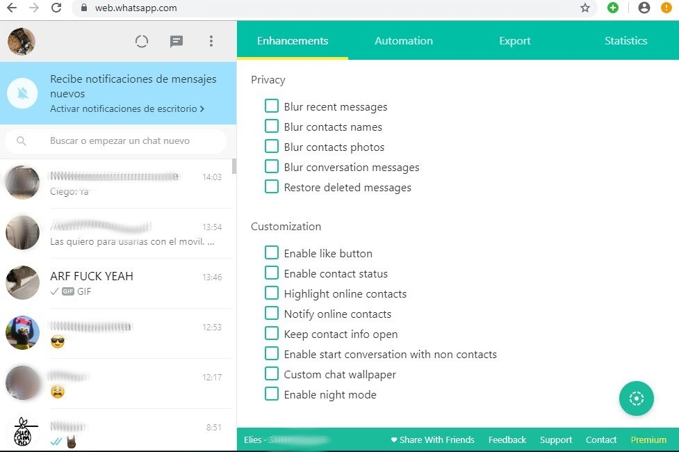 - Haz clic en el ícono de WA Web Plus y activa las funciones que quieras.