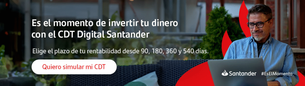 Santander Colombia dispone de un CDT Digital Santander que permite inversiones 100% en línea, con montos mínimos, plazos definidos y simulación previa. (cdt.santander.com.co)
