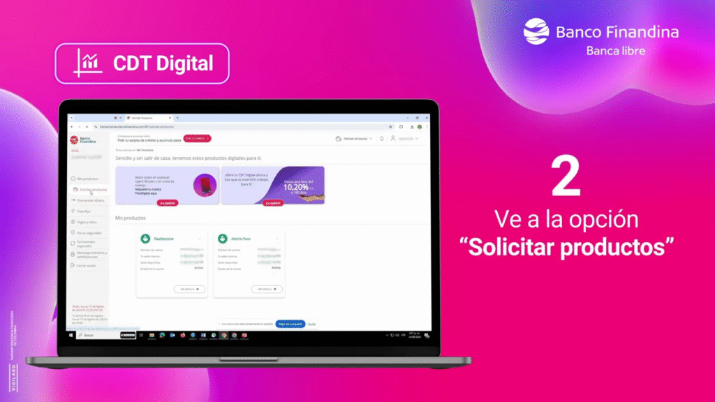 - Ir a la sección de productos/inversiones o “CDT Digital”.